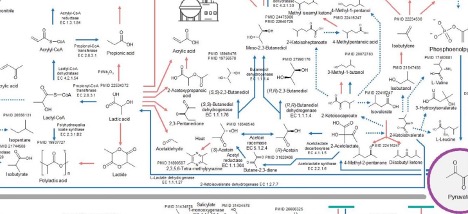 Back to the detail: the blue line leading from pyruvate to the left, ending up at a molecule called lactic acid, represents the enzyme reaction caused by lactate dehydrogenase, or LDH. LDH is a very well-studied enzyme that is found in every tissue, in a variety of forms, throughout the body.